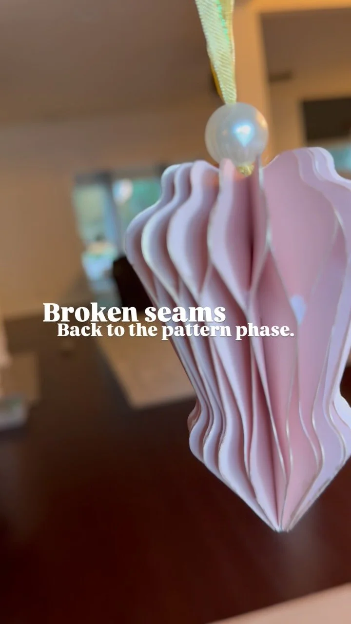Pink paper Christmas tree ornament hanging on a decorated Christmas tree.